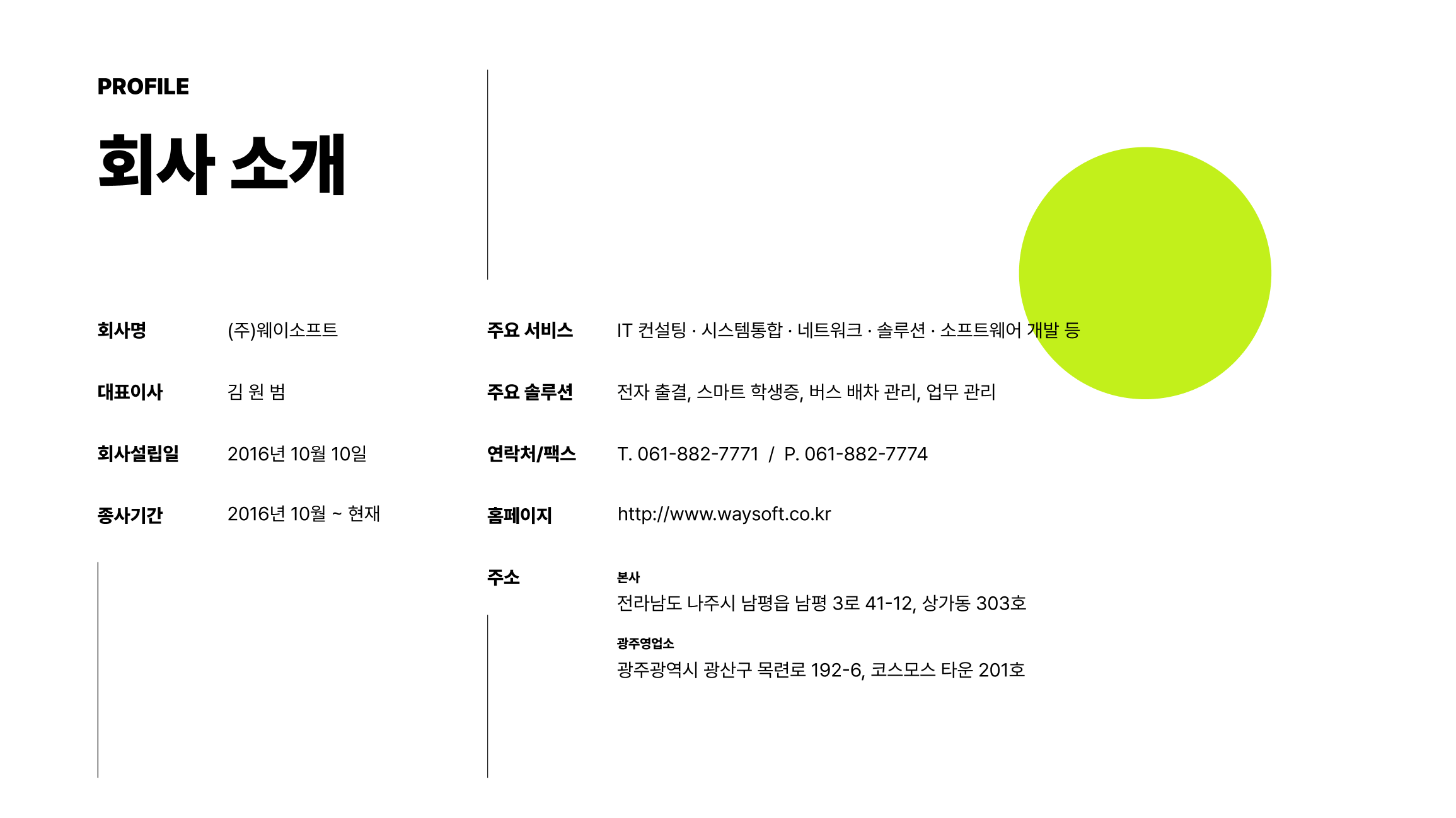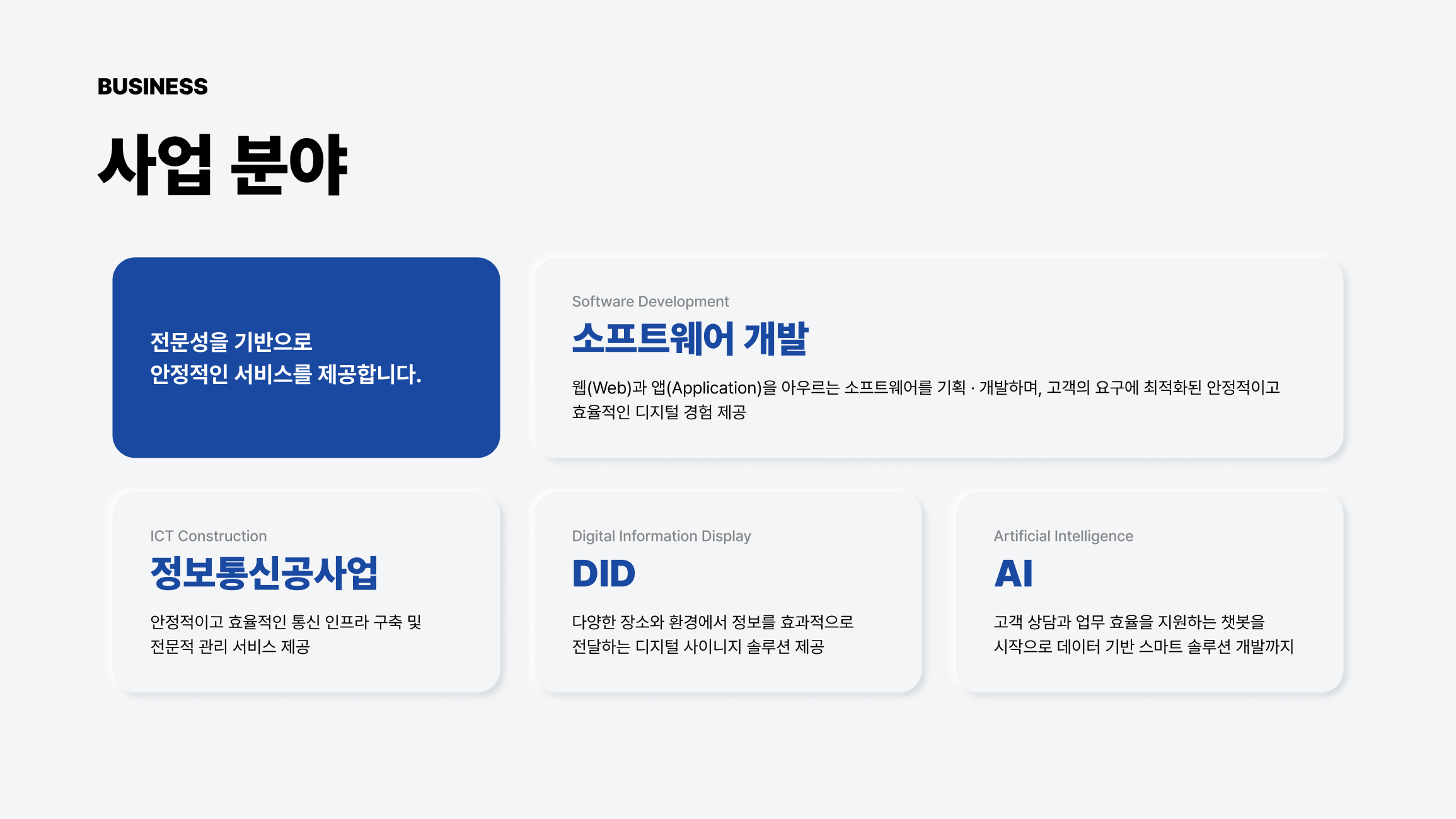 그 결과 IT 개발사업을 비롯해 정보보안, 디지털 사이니지 등 다양한 분야에서 신뢰받는 솔루션을 제공하며 성장해왔습니다.