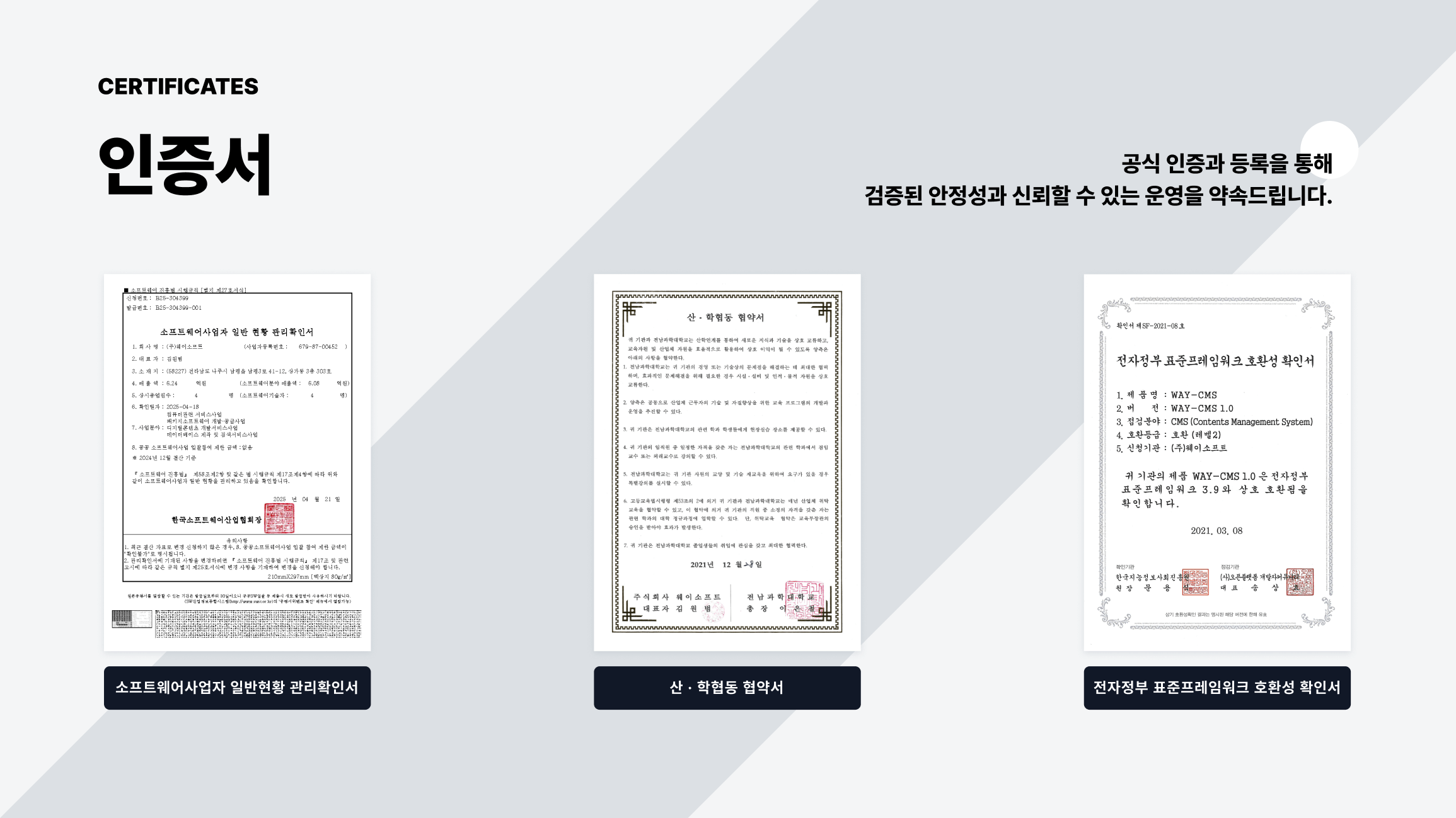 경영혁신형 중소기업 및 강소기업 인증을 통해 기술력과 경쟁력을 인정받은 우리는, 안정적인 기반 위에서 더 큰 도약을 준비하고 있습니다.