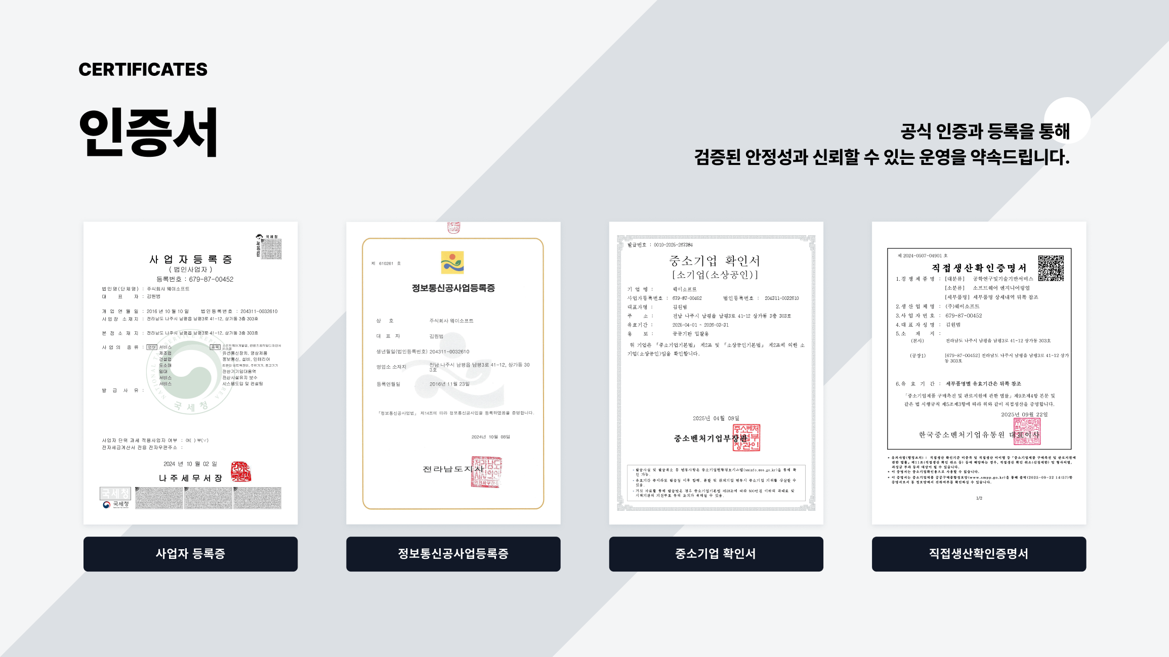 고객 만족을 최우선 가치로 삼아, 우수한 인재 확보와 기술 개발, 품질 혁신에 꾸준히 노력해왔습니다. 그 결과 IT 개발사업을 비롯해 정보보안, 디지털 사이니지 등 다양한 분야에서 신뢰받는 솔루션을 제공하며 성장해왔습니다. 경영혁신형 중소기업 및 강소기업 인증을 통해 기술력과 경쟁력을 인정받은 우리는, 안정적인 기반 위에서 더 큰 도약을 준비하고 있습니다.